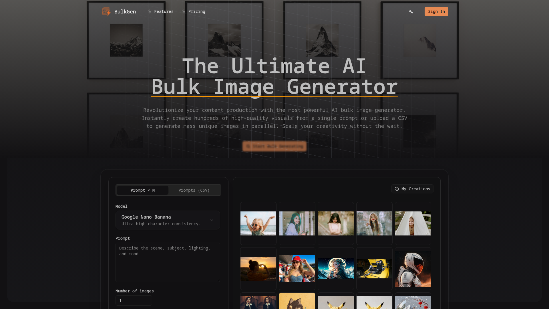 Generate hundreds of AI images quickly with BulkGen. Perfect for content creators, e-commerce, and agencies needing scalable visual content.