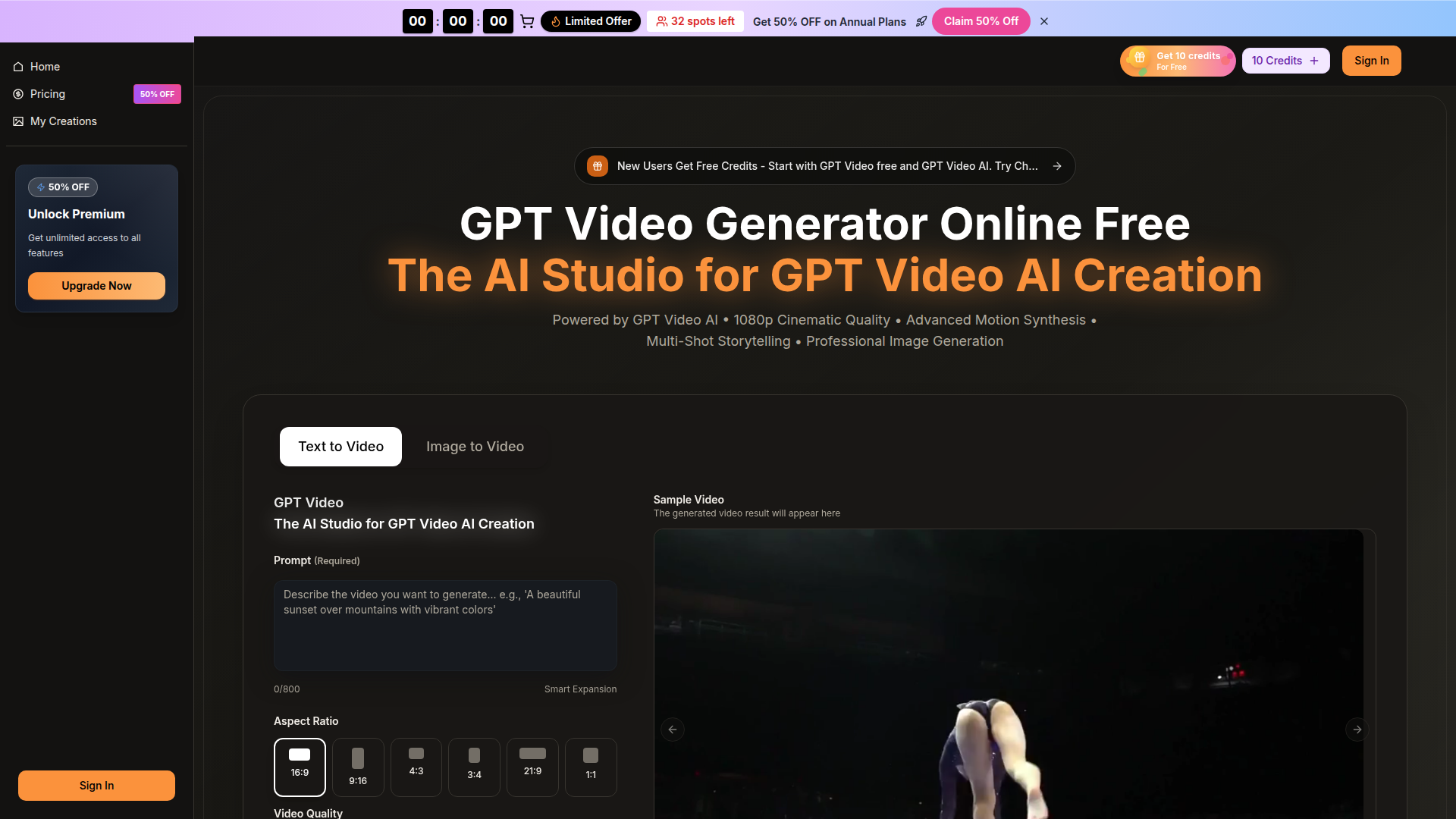 Create stunning AI videos online free with GPT Video. Transform text and images into high-quality videos effortlessly. Try it now!
