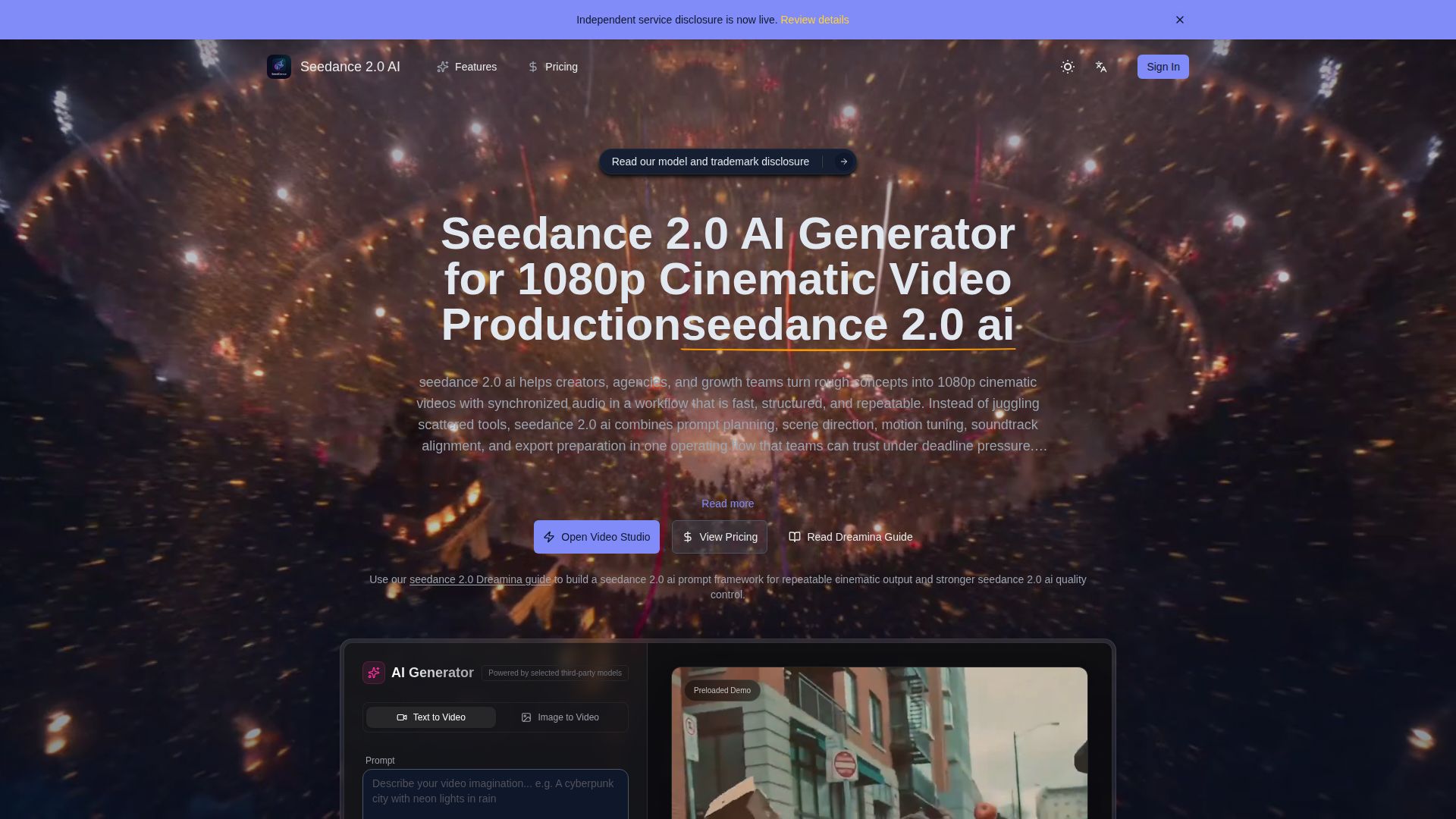Seedance 2.0 AI revolutionizes video production by allowing creators and agencies to transform concepts into high-quality 1080p cinematic videos. It streamlines prompt planning, scene direction, motion tuning, and soundtrack alignment into one efficient workflow. Designed for reliable production, Seedance 2.0 AI ensures quality checkpoints for hook strength, continuity, and channel fit. It is perfect for launch campaigns, social media shorts, product explainers, and retention-focused creative variations, making it ideal for teams looking to scale creative testing and confidently publish content.